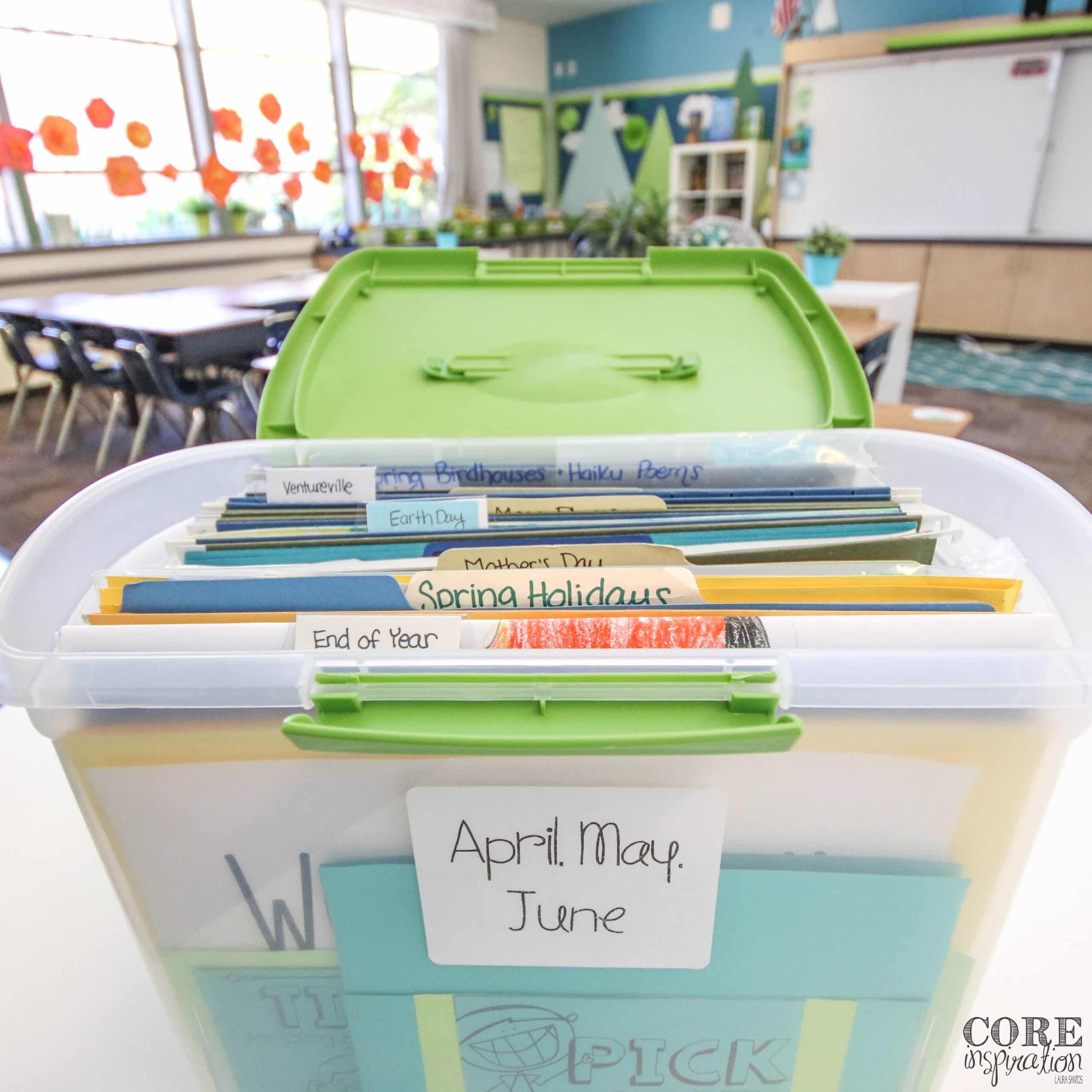 Keep the bins for upcoming and past units in your cabinet so they’re out of sight, and pull the bins for your current units to a space where they’re easy to access daily. As you teach a unit, these bins can act as a catch-all for any resources you used and any new resources you gathered. When the unit is complete, take a moment to sift through the bin, eliminating any paper clutter, and get it organized for the following year in a snap.