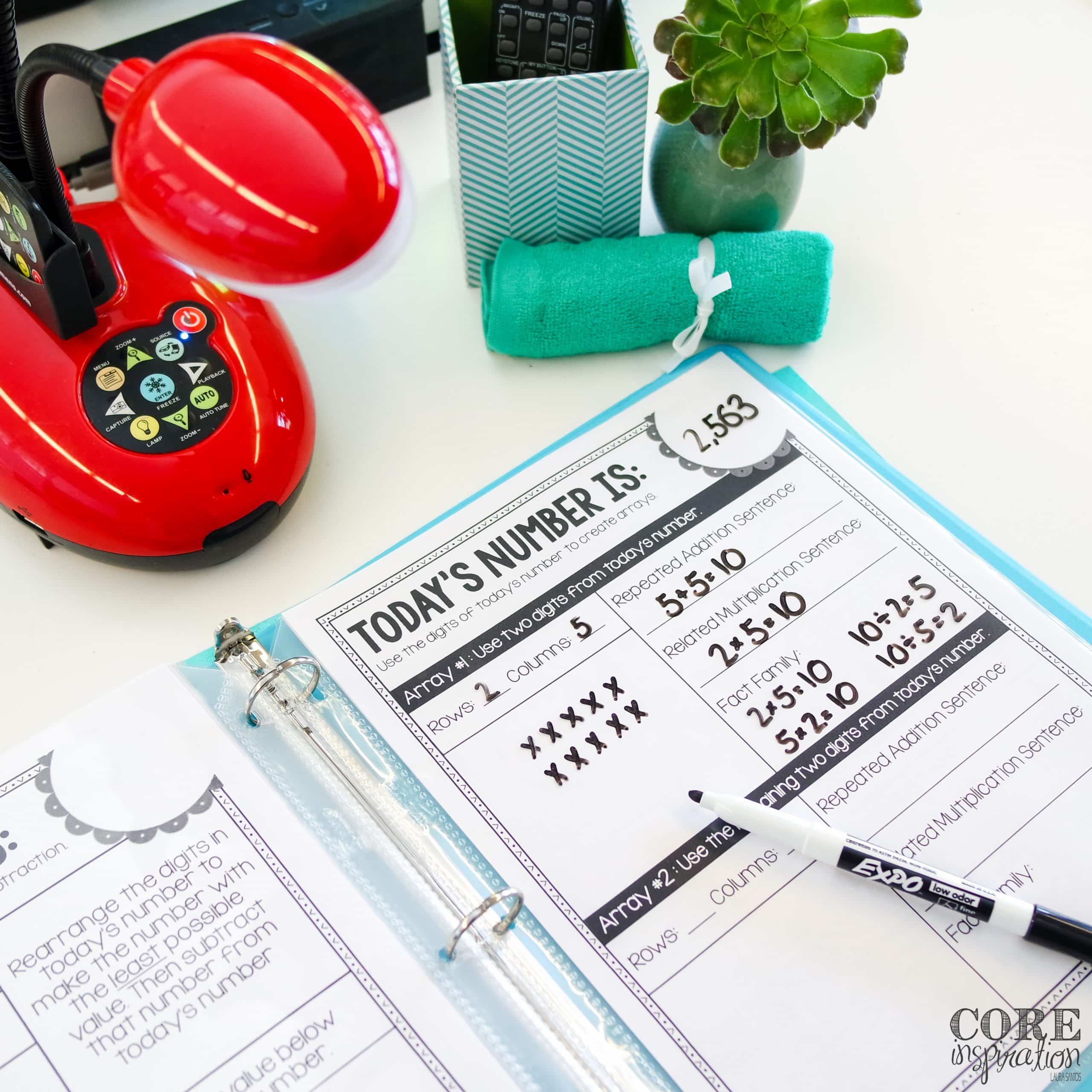 Students grab their Number of the Day supplies (their binder, a thin black whiteboard marker, and a whiteboard eraser), and get started with the daily spiral review math activities inside their binder. In our classroom, we store these supplies right inside our desks because students use them every day.
