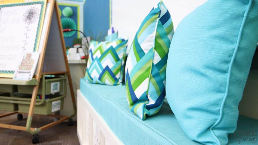 Before I describe each area of my classroom and share links, a bit of background information about the process behind designing this classroom layout. I have been teaching for seven years, and have consistently used the same blues and greens throughout my classroom design. This is a huge money saver because I can spend a little extra on higher quality organization tools, and decor items that get reused year after year.